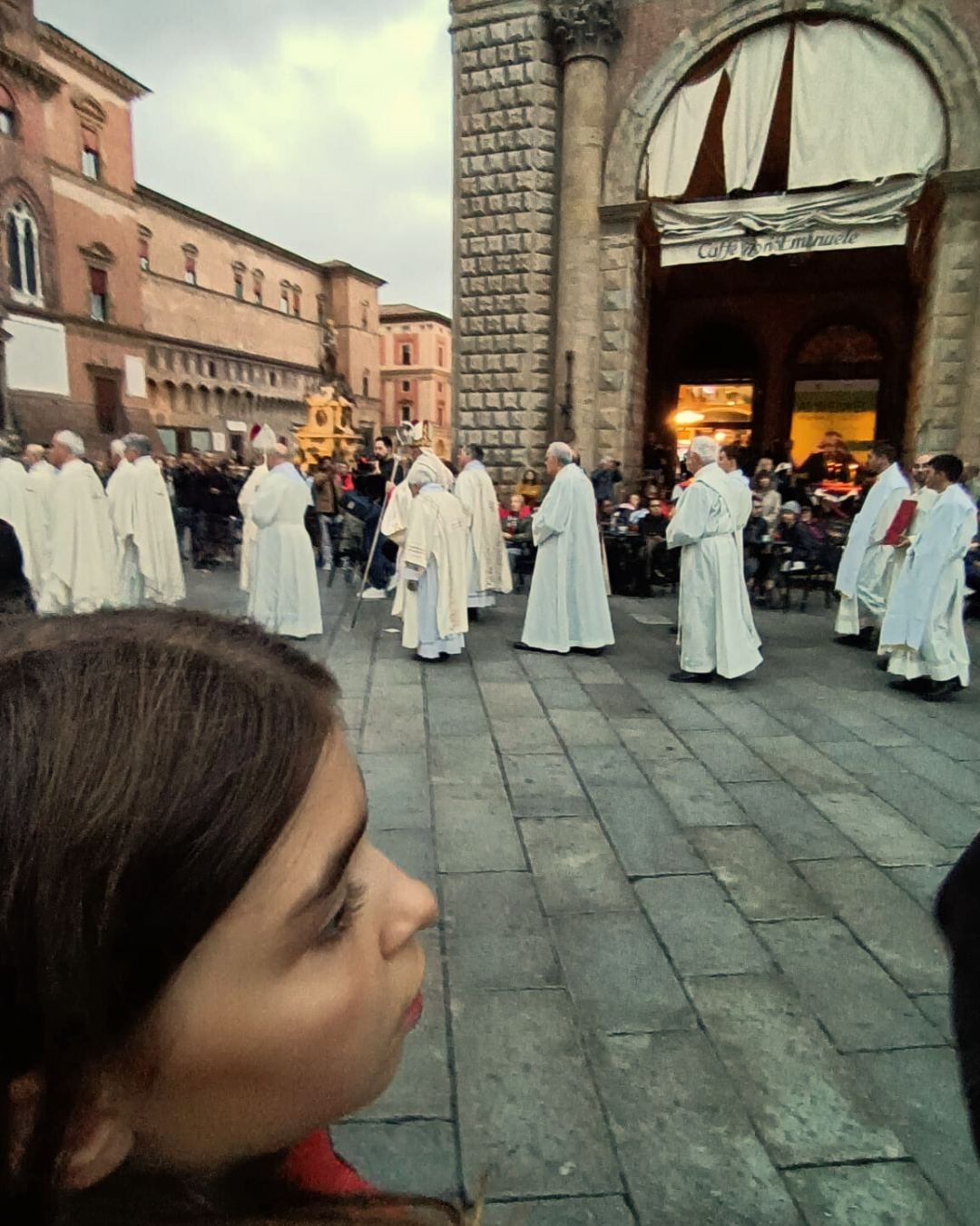 A metà pomeriggio cambio della guardia. Sui gradini che portano alla basilica di San Petronio salgono i bambini della quinta elementare della scuola il Pellicano. Giampiero Pizzol e Laura Aguzzoni della Compagnia Bella giocano con i bimbi alla scoperta di chi è San Petronio, cosa fa un vescovo che, come le maestre fanno con i loro bambini, dedica al suo gregge la vita. Tra le parole rilanciate e mimate dai bambini spicca compagnia. Non a caso la Pellicanto Band ritorna sul palco per cantare e far cantare "Viva la company". Uno dei giapponesi ripete il titolo della canzone e muove le braccia come ha visto fare dai bambini. Ha capito il senso della festa."